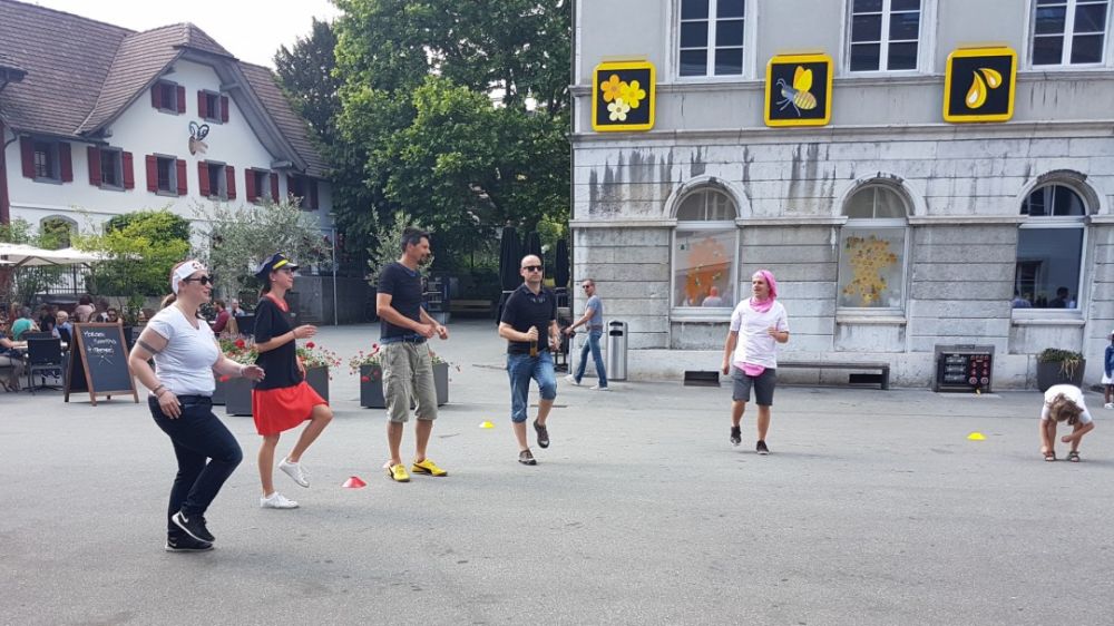 Zuerst muss Sie Passanten finden welche Sie, wie es sich gehört in einem WM Jahr für ein Fussballspiel gewinnen musste. Sie hatte Glück und in unmittelbarer Nähe gab es eine Gruppe «polternden» Jungs und eine geballte Ladung Obernaare welche sich im Gryffe aufhielten.