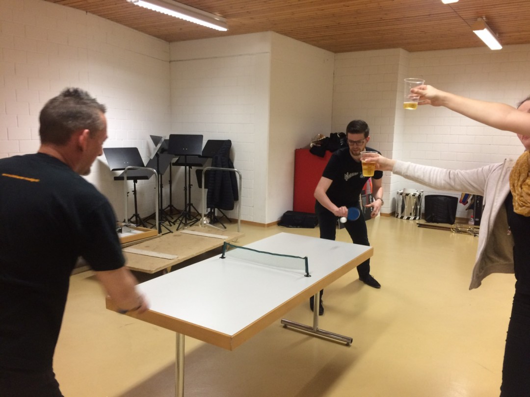 Alle Vorbereitungen waren getroffen und so erschienen wir pünktlich um 19:15 Uhr Mittwochs im Mühlemattsaal in Trimbach. Soundcheck stand da auf dem Programm, was bedeutete, dass wir unsere Stücke spielten und anschliessend zum leiserem Spielen und „bääsele“ verdammt wurden, da einige wie ein HEILIGES Kanonenrohr zu spielen schienen. Das Abschlusslied der Banausiade, der „Nabucco“ gelang ohne Schwierigkeiten und die Sprechrollen meisterten ihren Teil mit Bravour, auch wenn sich hier und da noch einige Unstimmigkeiten und Fehler einschlichen. Diese konnten dann jedoch GOTTseidank geklärt werden.