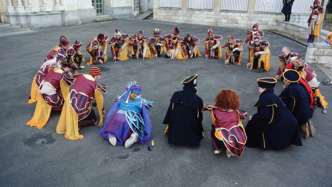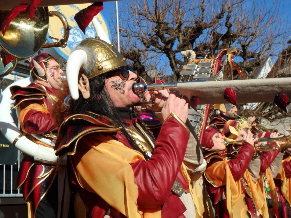 Nach bisher 3 tollen Fasnachtstagen und akutem Schlafmangel heisst es am Samstagmorgen wieder raus aus den Federn und ab ins Guggenlokal zum Brushen. Es herrscht emsiges Treiben, begrüsst Bleichgesichter, fertig besprühte und fixierte Bohèmes, und gegen 13.15 Uhr treffen sich dann alle im Kostüm mit Instrument im Hof zum Einspielen.