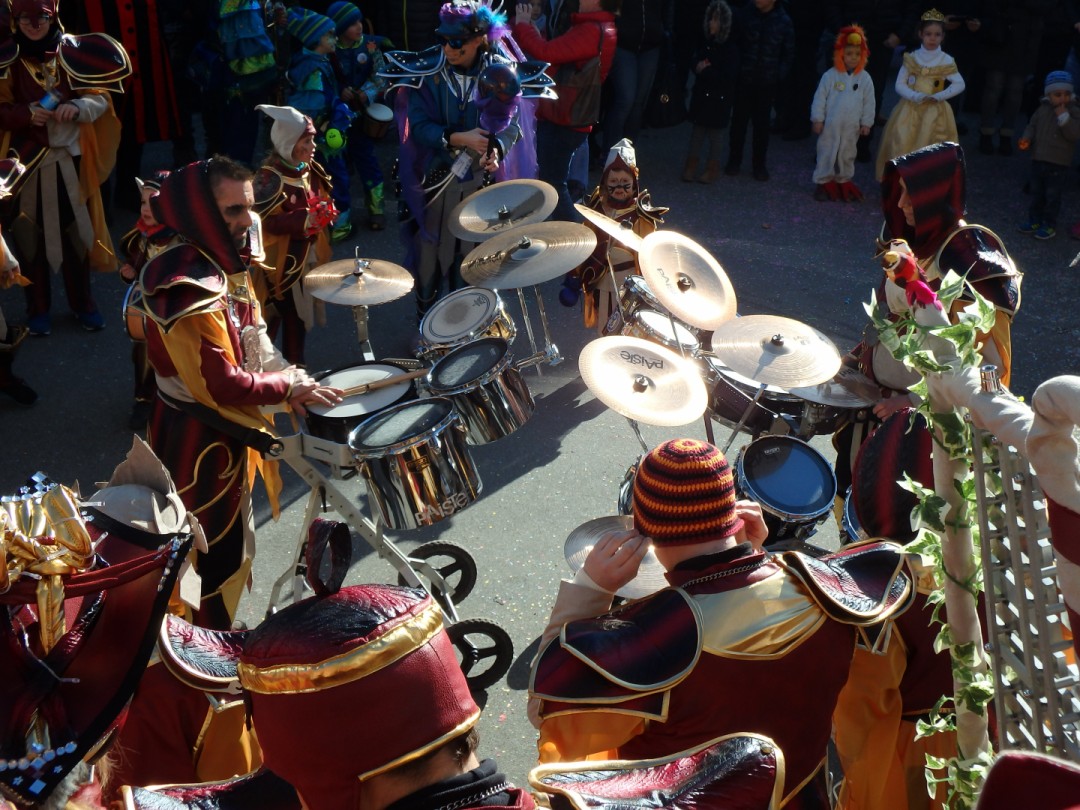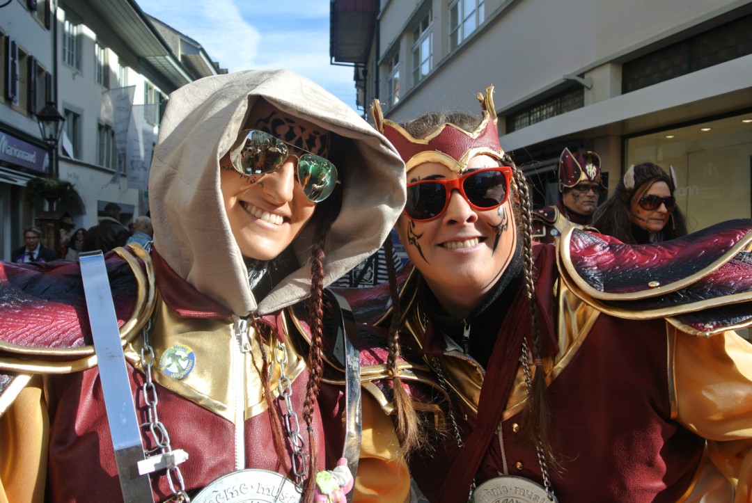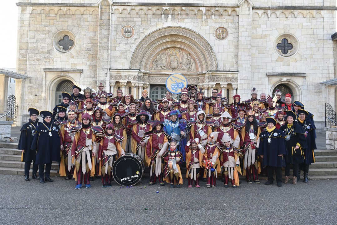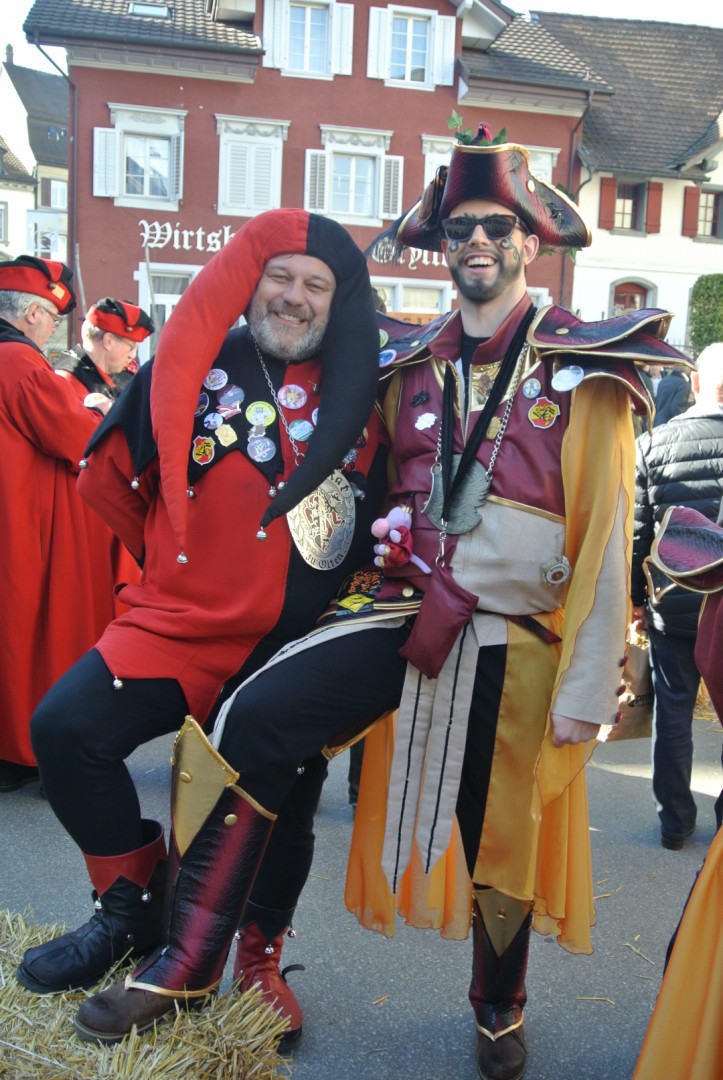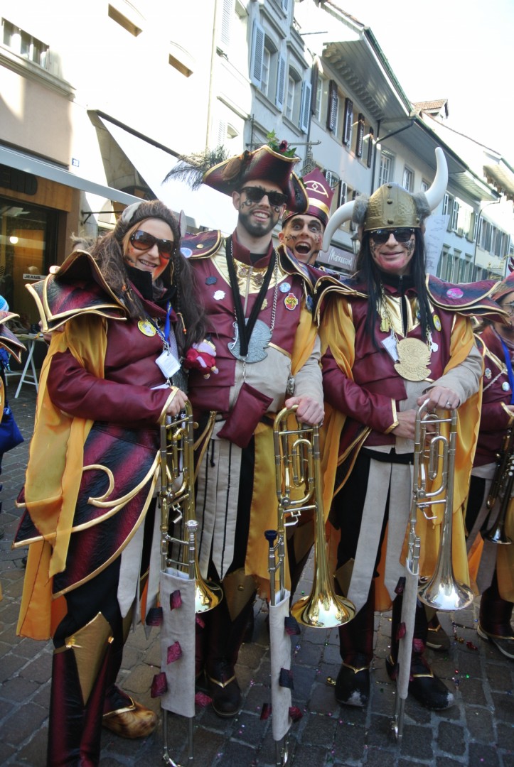 Viele Leute tummeln sich in der Stadt und vor dem nächsten Musizieren beim Hübelischulhaus wird wiederum die Zeit zum Plaudern mit Fans und Angehörigen genutzt. Um 16.00 Uhr eilen alle ins Bohèmehaus um die Maske zu holen, denn jetzt folgt ein intensives Fotoshooting bei der Martinskirche. Ganze Gugge mit und ohne alte Garde, Registerfotos und Einzelfotos sind bald digital erfasst.