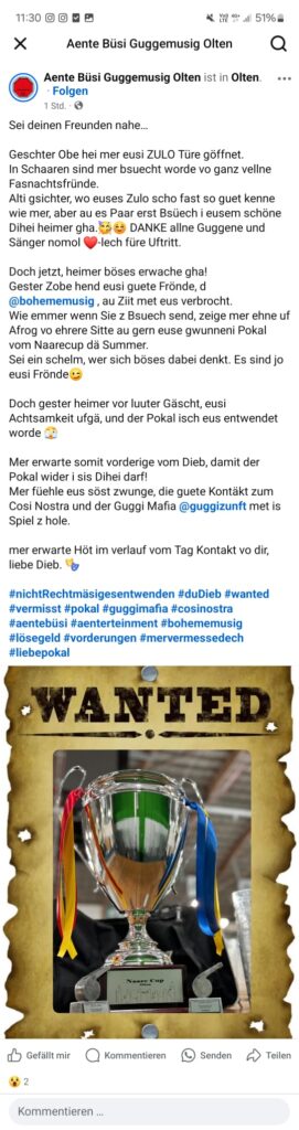 Der Fasnachtssamstag beginnt mit einem Rückfall in unsere diebische Vagabunden-Vergangenheit: Ein verdienstvolles Bohème-Mitglied raubt den Naarenpokal aus der Aentebüsi-Bierschwemme, was dort einen Entrüstungssturm auslöst. Man droht uns mit der Mafia von Cosi Nostra, worauf wir den Pokal im Bohème-Haus gut verstecken müssen. Die Situation eskaliert, als die Aentebüsi unser Lokal blockieren und das Bohèmeli mit einem ihrer Kleber abdecken. Auf unser Verlangen hin, beginnen sie für uns zu spielen. «Dirty Old Town» tragen sie aber so lange vor, bis die Bohème entnervt aufgibt und den Pokal mit schuldbewusster Miene wieder zurückgibt. Die Episode endet mit einem versöhnlichen gemeinsamen Apéro beim Bohème-Barwagen.