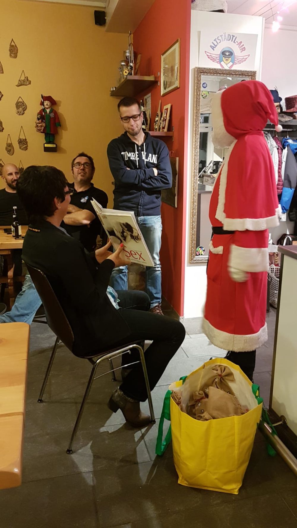 Nach dem Znacht erschien auch schon der Samichlaus, der wie jedes Jahr erneut einige unserer Mitglieder tadeln musste. Natürlich kamen wie immer zu erst die Neumitglieder dran. Nach ihren schönen Sprüchen durften sie sich mit ihren Chlausensäcken zurückziehen. Nur das eine Neumitglied welches an dieser Stelle wahrscheinlich nicht erwähnt werden muss, wurde noch ein paar weitere Male hervorgerufen. Es wurden noch reichlich mehr Mitglieder zurechtgewiesen oder auch gelobt. Diejenigen, die keine Verse konnten, erhielten eine gerechte Strafe. Das führte dazu, dass wir ein improvisiertes Ständchen von einem Männerchor geniessen durften.