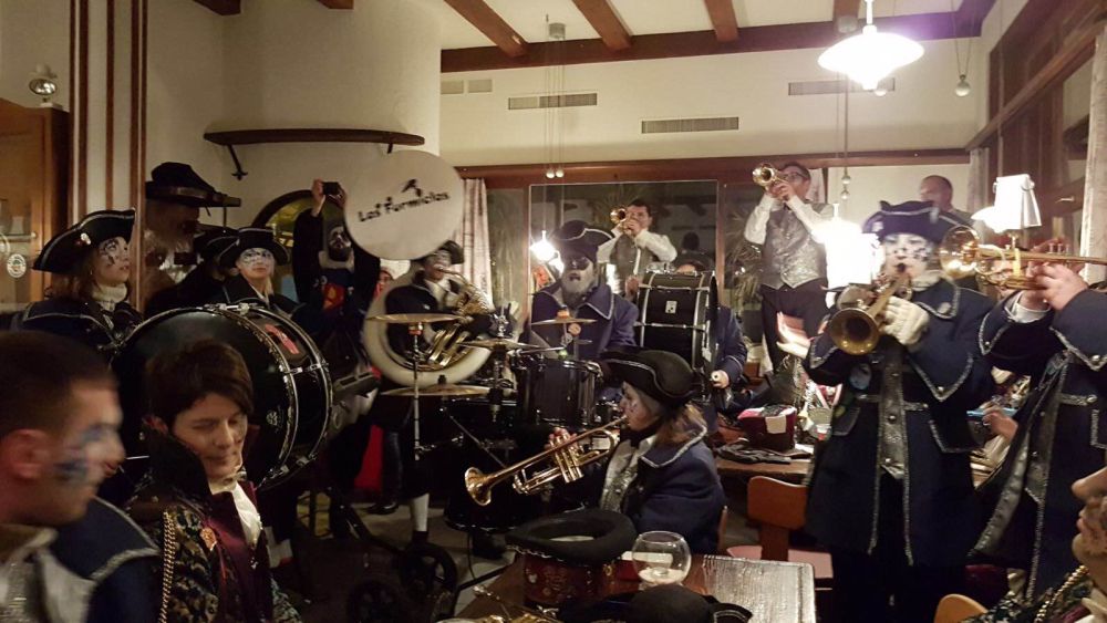 Traditionell stellten sich nun die Bohèmes mit Fackeln bestückt in der Altstadt auf und standenSpalier für den nahenden TROPFI-Umzug. Beim Umzug mit dabei natürlich auch unsere wunderschöne Laterne. „Gässelnd“ zogen wir zur Alten Mühle, in welcher wir unseren nächsten Auftritt hatten. Leider spielten wir fast vor leeren Rängen. Der Auftritt war aber auch vor allem unserem Tobi gewidmet. Durften wir doch genau um Mitternacht seinen 30igsten Geburtstag feiern! Mit einem gesponserten Getränk und musikalischer Unterhaltung durch die „Las Furmiclas“ konnten wir somit gemütlich mit Tobi anstossen.