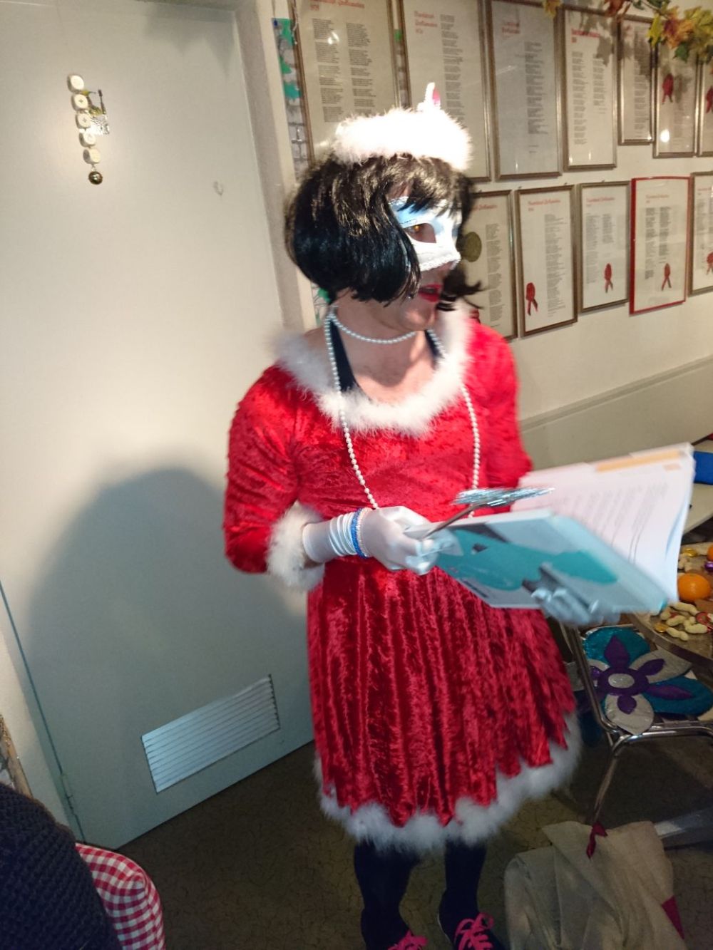 Die Bohème-Bar war heimelig dekoriert und die Tische mit den Lebkuchen, Schöggeli, Chrömli, Nüssli und Manderinli luden zum geselligen Beisammensein ein. Doch der Schein trog. Bald schon klopfte es an der Tür und schon machte sich Nervosität breit. Da war er auch schon. Er? Sie? Es? Hmmm. Die Gestalt, s Niggi vom Näggi, betrat die Bohème-Bar und liess den Samichlous entschuldigen. Er werde zum ersten Mal Grossvater und sei zmitz in den Vorbereitungen.Natürlich sandte er aber eine respektable Vertretung.