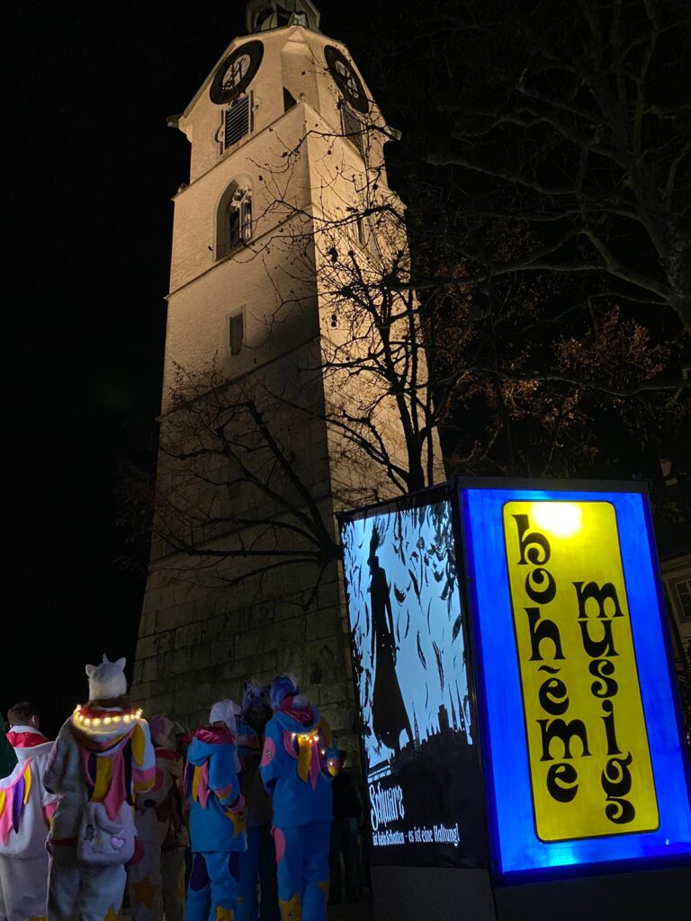 Im Terminus angekommen, war die Stimmung irgendwo zwischen „ausgelassene Fasnacht“ und „Sardinendose mit Musik“. Das Lokal platzte aus allen Nähten. Es gab leckere Teigwaren und haufenweise Getränke. Die ersten Bohèmes kapitulierten angesichts der Dichte und retteten sich ins Zelt. Dort tröpfelten sie nach und nach ein, bis man meinen konnte, das Zelt sei offiziell in „Bohème-Hauptquartier“ umbenannt worden.