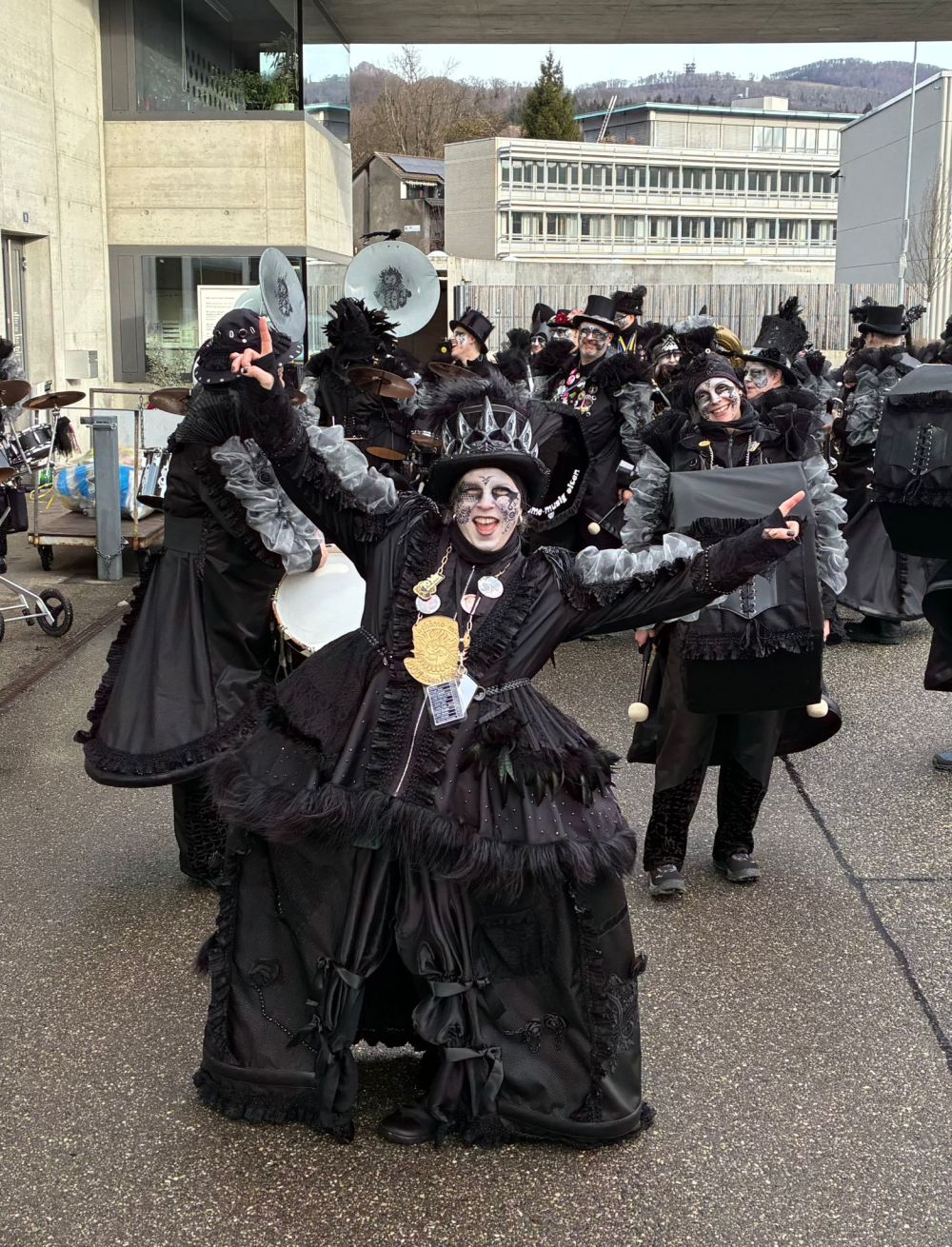 Frisch gebrusht zogen wir los zum Obernaarenapero im Terminus. Leider hatte das Wetter beschlossen, auch mitzufeiern – allerdings als Sturm. Urmels Hut trat zur ersten grossen Bewährungsprobe an… und verlor spektakulär. In der hintersten Reihe hob nicht nur der Hut ab, sondern gefühlt auch der ganze Posaunenzug. Gemerkt haben das natürlich alle. Ausser sie selbst. 😊