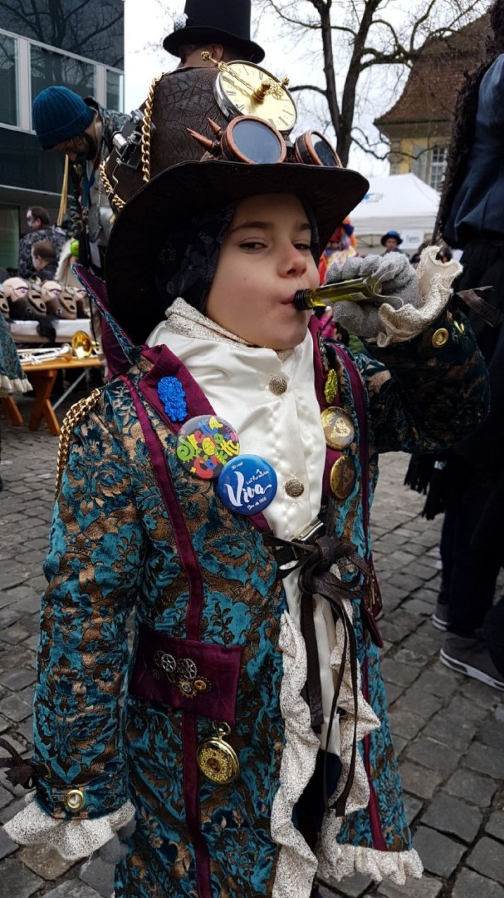 Als wir dann zum nächsten Auftrittsort verschoben hatten, gönnten sich einige Bohèmes eine köstliche Racletteschnitte und/oder ein warmes Getränk bei den kalten Temperaturen. Unsere alte Garde und andere Bohème-Anhängsel klatschten und schunkelten dann munter mit bei unserem Auftritt. Wir liessen uns auf jeden Fall von der Kälte nicht beirren und genossen den Auftritt und beendeten diesen mit der fast schon traditionellen Polonaise während dem «Io senza te». Kurz darauf machten wir uns auf den Weg in die Altstadt, wo wir, wie jedes Mal in Brugg, auf der Treppe noch einige Lieder zum Besten gaben. 2 Bohèmes mussten dabei unsere Formation schon etwas früher verlassen um sicherzustellen, dass sie beim nächsten Auftritt pünktlich vor Ort sind. Dieser eben genannte Auftritt fand im Salzhaus statt, wo alles nach dem Motto Steampunk eingerichtet war. Wir erhielten eine spezielle Ansage und durften noch für ein Foto mit den Organisatoren des Events im Salzhaus posieren. Mehr Steampunk geht nicht. Unser letzter Auftritt dieser Fasnacht verlief super, die Stimmung war grandios und wir spielten, im wahrsten Sinne des Wortes, bis die Bänke krachten.