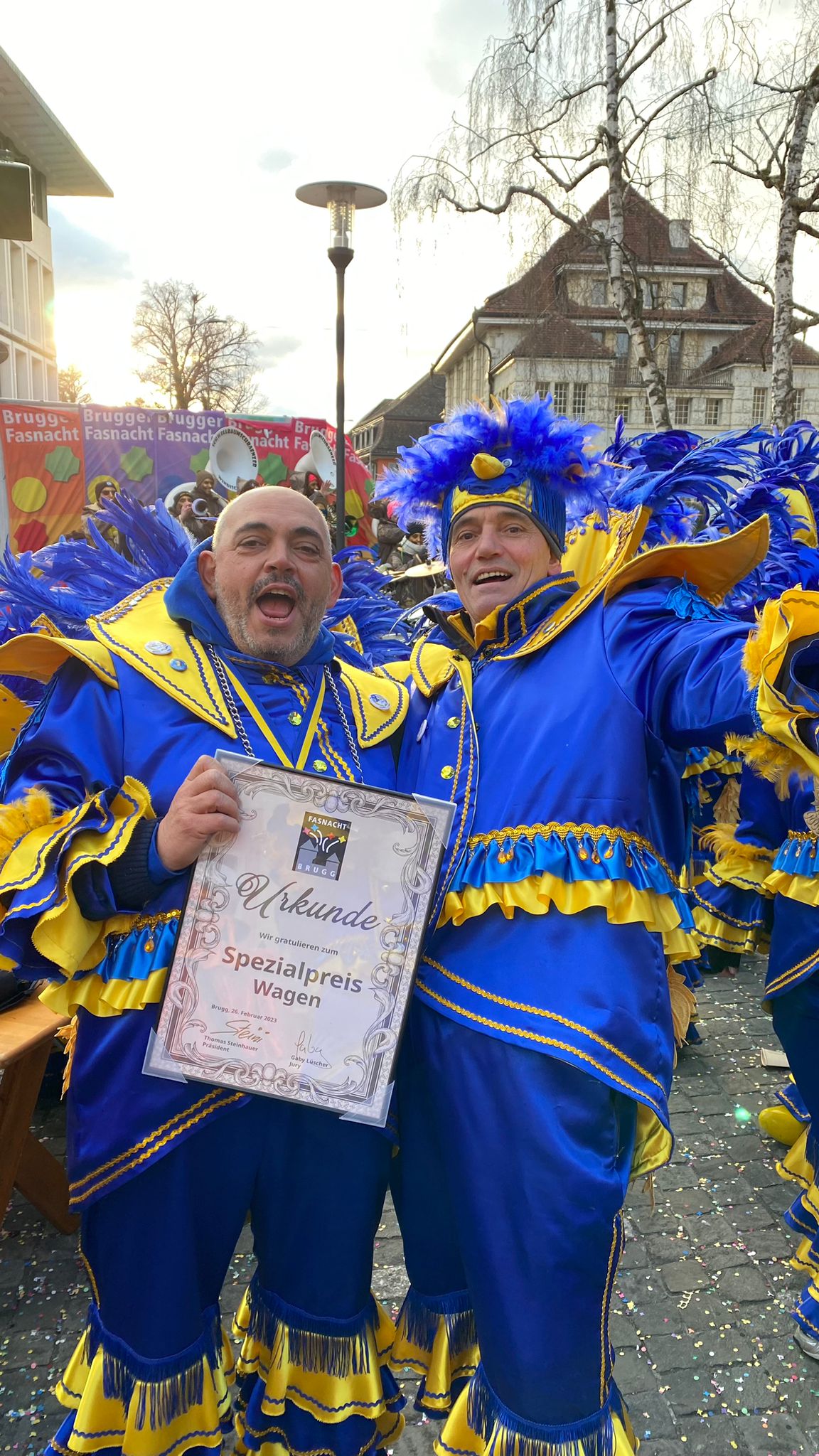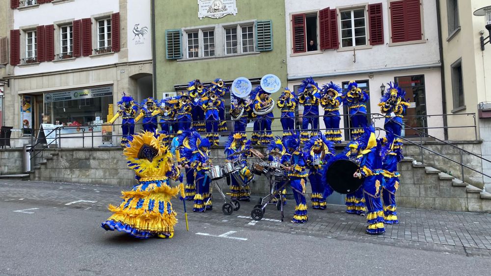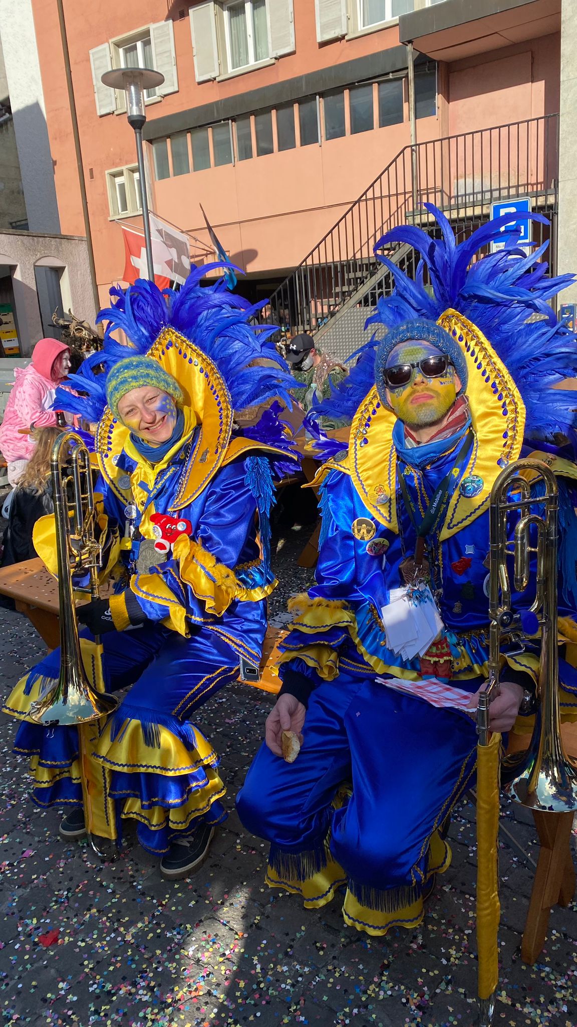 Beim Start vom Umzug, wo unser Wagen mit Crew auch dabei ist, schneit es, unter anderem auch blaue und gelbe Konfettis. Der Wind denkt nicht im geringsten an Pause und bläst durch alle Öffnungen unserer Masken und reisst an allen Federn. Bbrrrrr die Kälte ist echt ungemütlich. Aber wir lieben ja Umzüge und freuen uns drauf! Unser stellvertretender Fahnenträger Koni kämpft, wie eine Woche zuvor Dominik, ebenfalls mit dem Wind von allen Seiten, bleibt aber siegreich. Genauso ergeht es auch unserer Tambourmajorin mit grosser Maske und sehr weitem Kostümrock.