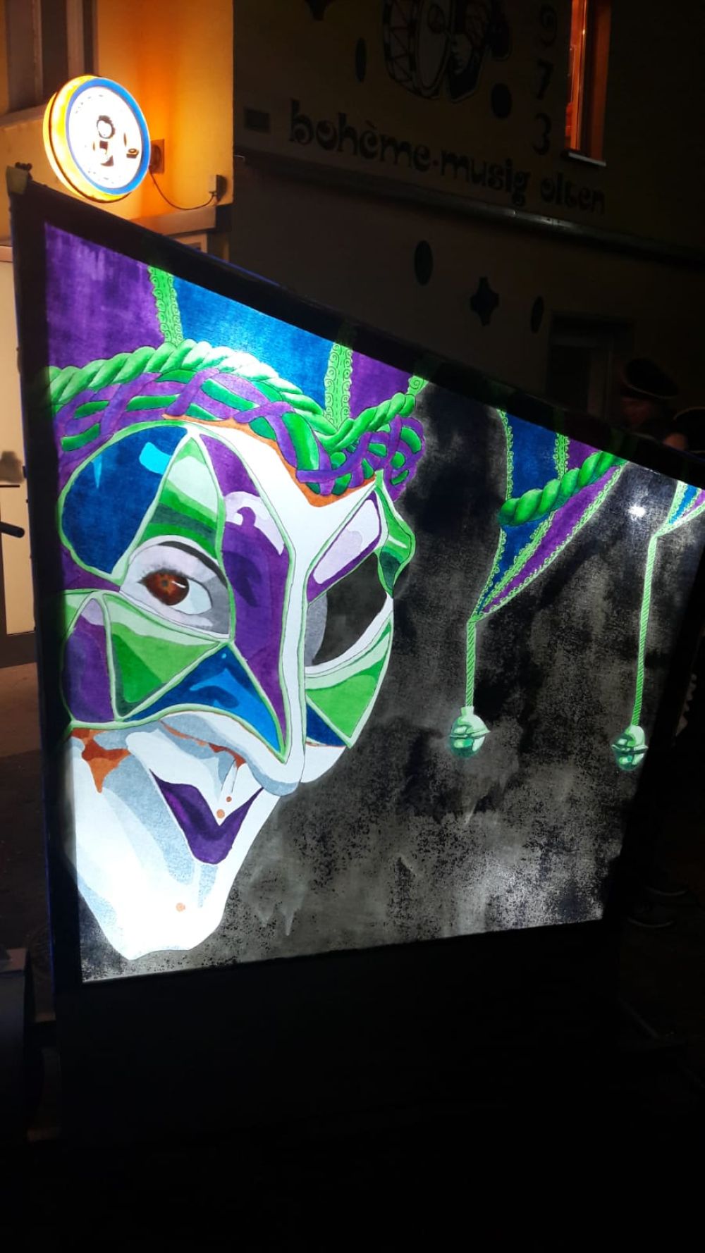Wir treffen uns also im Bohème-Haus, lauschen noch den Worten des Vize Rotscher zu den letzten News und noch einmal wichtigen Eckdaten zur Fasnacht 2019. Gekleidet im letztjährigen Kostüm treffen wir uns zum Laternenapéro. Die Kreateure Vijay, Katja, Conny und Ramona haben wieder eine tolle und sehenswerte Laterne geschaffen, die vor allem in den Farben der neuen Fasnachtskleider leuchtet.