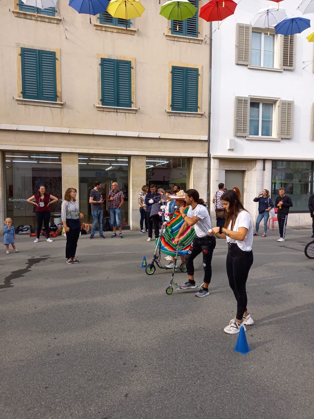 Die Prüfung fand auf dem Kirchplatz vor dem «Gryffe» statt, wo sich Denise vorher Freiwillige beschaffen musste. Gegen ihre auserwählten Rivalen musste sie in einem sportlichen Wettbewerb ihre Fähigkeiten in Sachen Ballwerfen und -fangen unter Beweis stellen. Noch dazu radelte sie schwungvoll mit einem Tretfahrzeug über den Kirchplatz. Diesen Teil bewältigte sie tadellos und wir beendeten diesen Teil der Prüfung mit einem «Lunchsäckli».