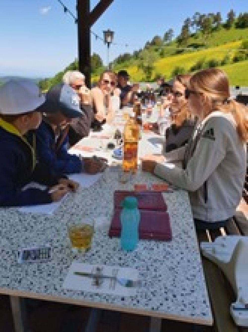 Die Stimmung war von Anfang an sehr gut und auch unsere kleinste Teilnehmerin Amelie war bereits top fit als wir die Reise antraten. Auf dem Berg angekommen gingen wir direkt los. Ja ihr hört richtig, ohne einzukehren starteten wir unsere Wanderung. Wunderschöne Wege, tolle Natur und ein bisschen rauf und runter über den höchsten Punkt vom Kanton Baselland führte uns die Wanderung zum Restaurant, wo wir das Mittagessen bestellt hatten. Das Essen und das Bier hatten wir uns auch reichlich verdient. Bikerteller, Wanderteller, Fitnessteller super fein und eins ist sicher, so viel Salat haben wir wahrscheinlich noch nie gegessen dazu ein – zwei Flaschen Bier und ein gutes Dessert.