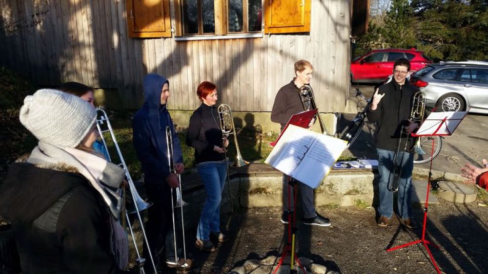 Am Sonntag ging es dann weiter. Auch dieses Jahr gab es wieder Rösti mit Speck und Spiegeleier. Um 10 Uhr hatten wir Besammlung und probten gleich weiter in den Registern. Nach der gesprächigen Mittagspause setzten wir erneut alle Register zusammen und machten den letzten Feinschliff. Zum Abschluss des Probeweekends musizierten wir gemeinsam vor dem Pfadiheim und genossen es, zusammen drausse Musik zu machen. Einige Anwohner aus Gränichen blieben während ihrem Sonntagsspaziergang sogar zu, um uns zuzuhören.