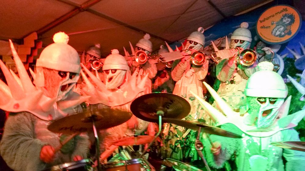 Mit dem Instrument, nach Möglichkeit passend dekoriert, besammeln sich die Musikanten im Hof um mit der Maske das erste Lied zu spielen. Ahh, ohh, Einige haben das Kleid oder Instrument mit Lichterketten und anderen Verzierungen aufgepimpt, wunderschön. In eher andächtiger Ruhe wird der kurze Weg zum ersten Auftrittslokal unter die Füsse genommen. Wird wohl unsere musikalische Darbietung, einstudiert und geprobt in den letzten 5 Monaten, und unsere Verkleidung die Zuschauer/hörer überzeugen, erfreuen und vor allem in Feststimmung bringen? Vor jedem unserer 6 Auftritte lauschen wir den Anweisungen unserer Tambourmajorin Ramona in schneeweissem Kleid mit leuchtender Schneeflocke als Dirigentenstab, es soll ja nichts dem Zufall überlassen werden.