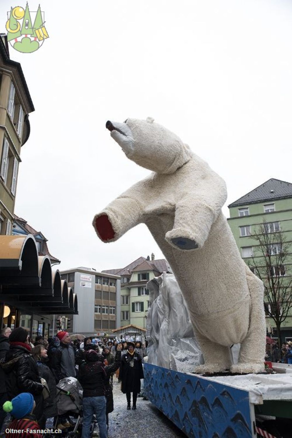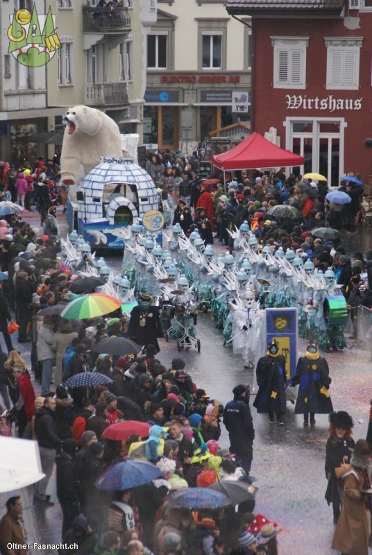 Bevor es mit dem Umzug losging, wurden wir von der Brushgruppe zu schönen Eismenschen gemacht. Während dessen wechselte draussen das Wetter ganz passend zu unserem Motto „ Eis wird zu Wasser – wo ist da der Bär?“. Sprich es fing an zu regnen und zu winden. Trotzdem trafen wir uns im Bohème Haus und marschierten gemeinsam zu unserer Startposition des Umzuges. Denn dort wartete bereits unser neuer Fasnachtswagen auf uns. Wie wird er wohl aussehen?? Als wir den Wagen sahen, waren wir überwältigt. Wir hatten unseren Bären gefunden! Er stand in seiner ganzen Pracht vor uns. Streckte sich und brüllte was das Zeug hielt. Ein solch toller Wagen konnte nur unsere Wagenbaugruppe zustande bringen, worauf wir mächtig stolz waren.