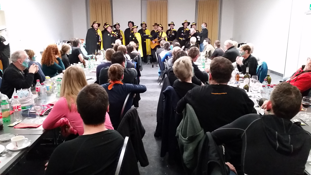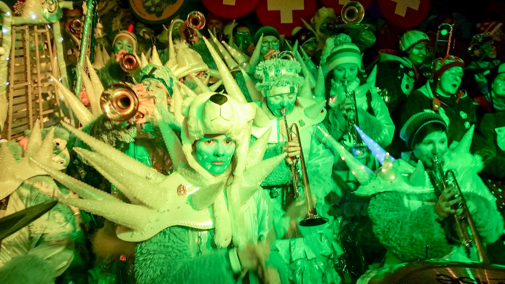 Dann Punkt 14 Uhr startete der Umzug. Naja…weit kamen wir nicht. Nach zweimal abbiegen standen wir schon für längere Zeit. Über die Gründe gibt es verschiedene Aussagen. Es ging weiter und irgendeinmal hatten wir dann den Umzug halbwegs trocken überstanden. Nachdem wir die Masken im Bohème Haus deponiert hatten, gingen die einen ans Monsterkonzert und die anderen bereiteten sich schon auf unseren Auftritt auf der Chelestäge vor, den wir zusammen mit den Müüs direkt nach dem Monsterkonzert hatten.