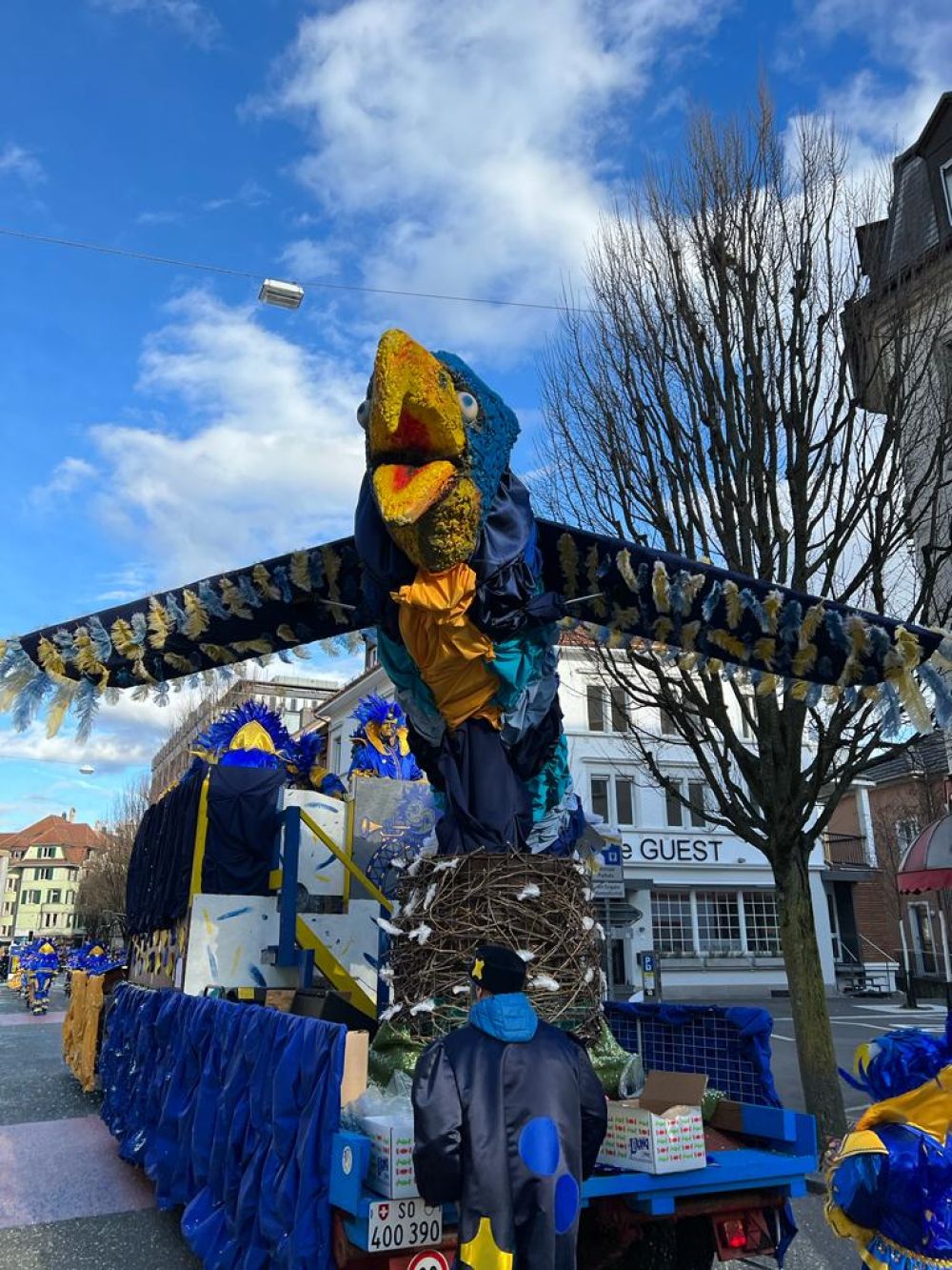 Nachdem wir alle schön farbig und genährt waren, durften wir während dem «Umzugslockermacher-Motivations-Wagen-Apéro» den wunderschönen Umzugswagen bestaunen, welcher von der Wagenbau-Gruppe mit viel Fleiss und Können erschaffen wurde. Natürlich immer mit dem Motto: «Es esch super und e freue me druf!!!»
