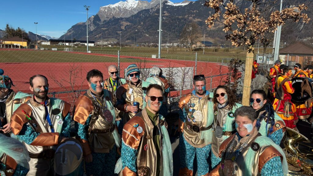Die Reise in die Ostschweiz startete bereits am Samstag um 09.30 Uhr. Wir fuhren mit dem Car an Zürich und dem Walensee vorbei, während die «echten» Fasnächtler im Bus geschminkt wurden. Nachdem alle Unterkunfts-Probleme überbrückt waren, machte sich die Bohème auf den Weg zum Umzugsstart. Es folgte ein ziemlich zäher Umzug, allerdings bei schönstem Wetter. Umrahmt wurden wir dabei von zappeligen Mini-Quallen und von einem wummernden Techno-Wagen. Im Zentrum beim Bahnhof spielten wir gleich nach dem Umzug zum allerersten Mal unsere neuen Stücke, und genossen dann den Rummel auf dem Festplatz und die Darbietungen der anderen Guggen von Igis, Zizers, Rüthi und Schwamendingen.