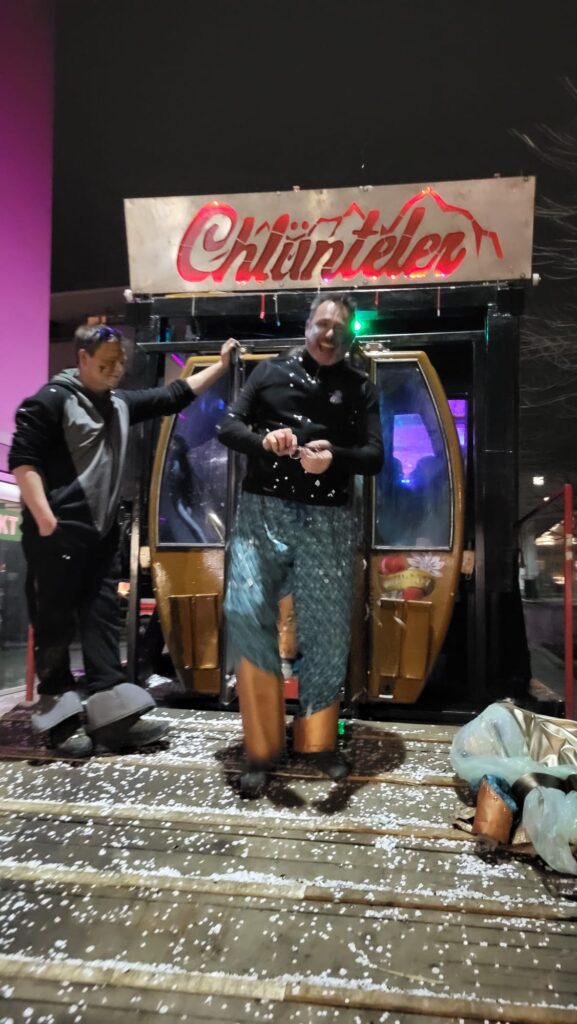 Mit der Abenddämmerung lösten sich auch die Probleme mit dem Hotel und der Massenunterkunft. Aufgefrischt besammelten sich die Bohèmes im Pfarrsaal zum exzellenten Risotto (mit Wurst) und zum phänomenalen Toblerone-Mousse, welche uns vom unterhaltsamen Personal der Kirchgemeinde gebracht wurden. Anschliessend begann das Abendprogramm. Zwei Innen- und zwei Aussenauftritte forderten uns dermassen, dass sich bei einigen von uns sogar die Genitalien verschoben. Wir hielten aber wacker durch. Die Kraft reichte sogar noch für ein intensives Nachtprogramm ohne Instrumente. Speziell erwähnt sei an dieser Stelle der späte Ritt von Rotscher und Vijay in der Konfetti-Gondel, sowie Dinus und Rotschers Morgendämmerungs-Besuch an der Plantahof-Night.