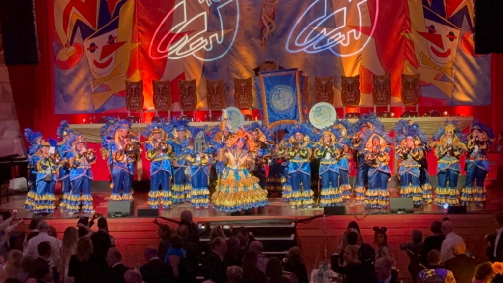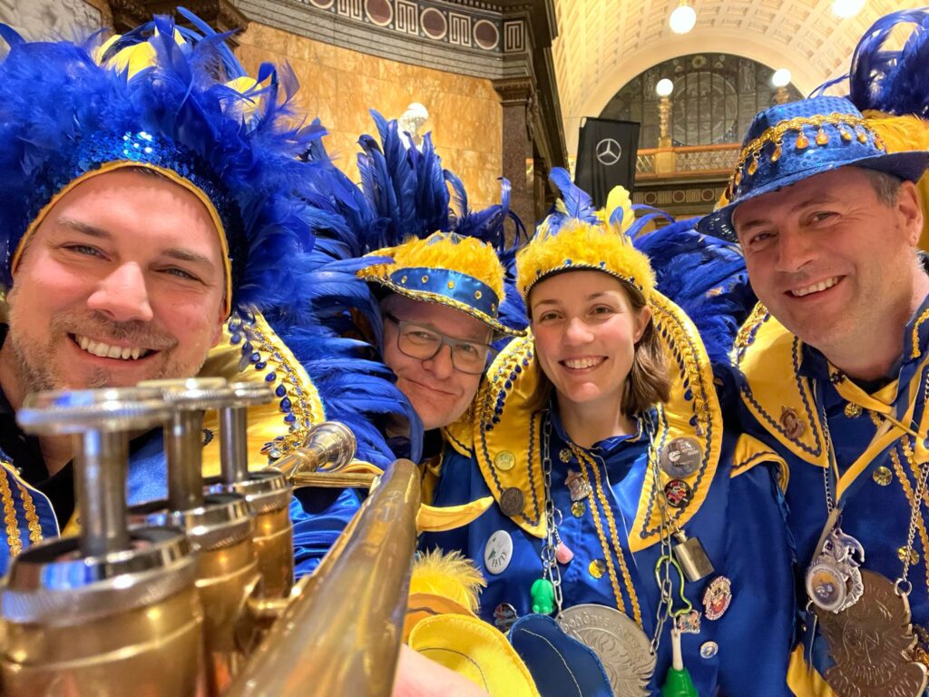 Kurz nach 11 Uhr durften wir dann durch die grossen Türen des Kursaals treten. Unser Einmarsch «mit Musik» durch den ganzen Saal kam beim Publikum super an. Ebenso gaben der altehrwürdige Kursaal, die stilvolle und fasnächtliche Dekoration des CCW, unser gelbblaues Jubiläumskostüm sowie unsere Guggenmusik ein unvergessliches Bild ab, was vom Publikum mit tosendem Applaus und spürbarer positiver Energie verdankt wurde. Ein grossartiger Einstieg ins Weekend, welcher Lust nach mehr schürte.